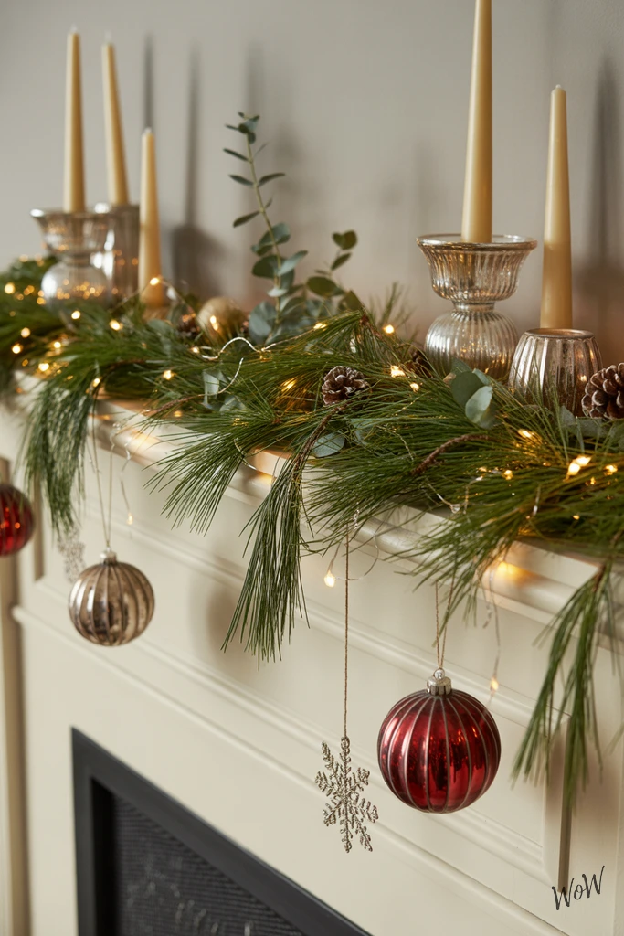 For extra sparkle, add a few mercury glass votives along the mantel, their shiny surfaces will reflect the twinkle and make the whole setup feel magical and starry. When placing your ornaments, use graduated sizes: anchor the ends with the largest pieces, then fill in with medium and small ones for a balanced, rhythmic look.