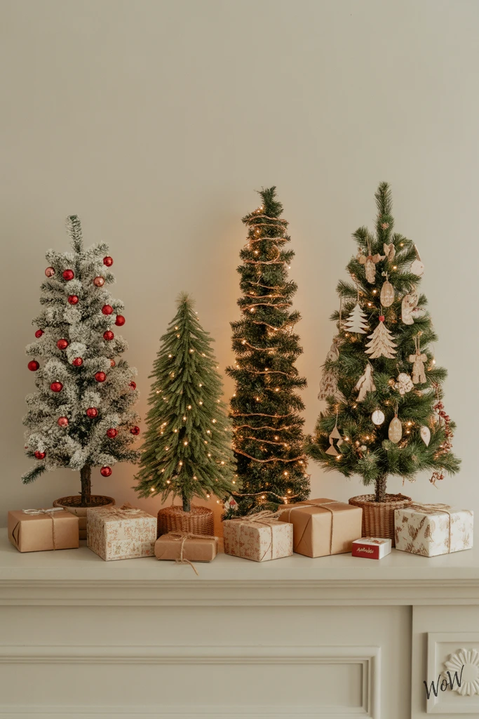 Arrange the trees across your mantel, staggering the heights and styles so it feels like a quirky little forest, not a row of soldiers. For extra festive flair, tuck a few small, wrapped gift boxes (in coordinating paper and ribbon) around each tree’s base.