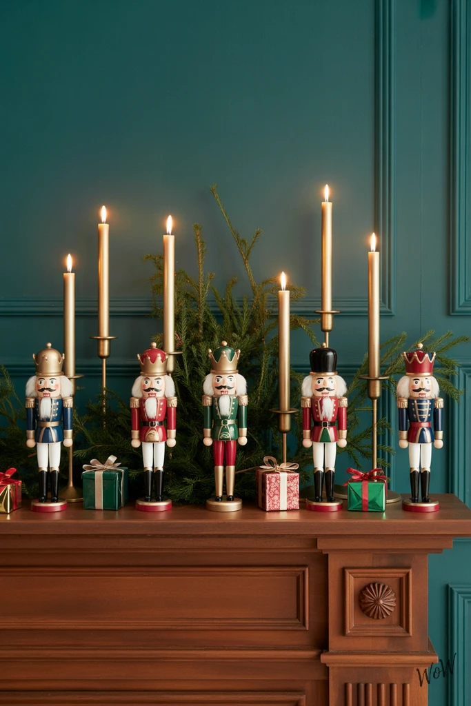 Line up a squad of classic wooden nutcracker figurines across your mantel, mixing different heights and uniform colors for a storybook effect. Slip gold taper candles in brass holders between each nutcracker-this keeps the scene from looking crowded, plus the metallic shine adds a bit of old-school elegance.