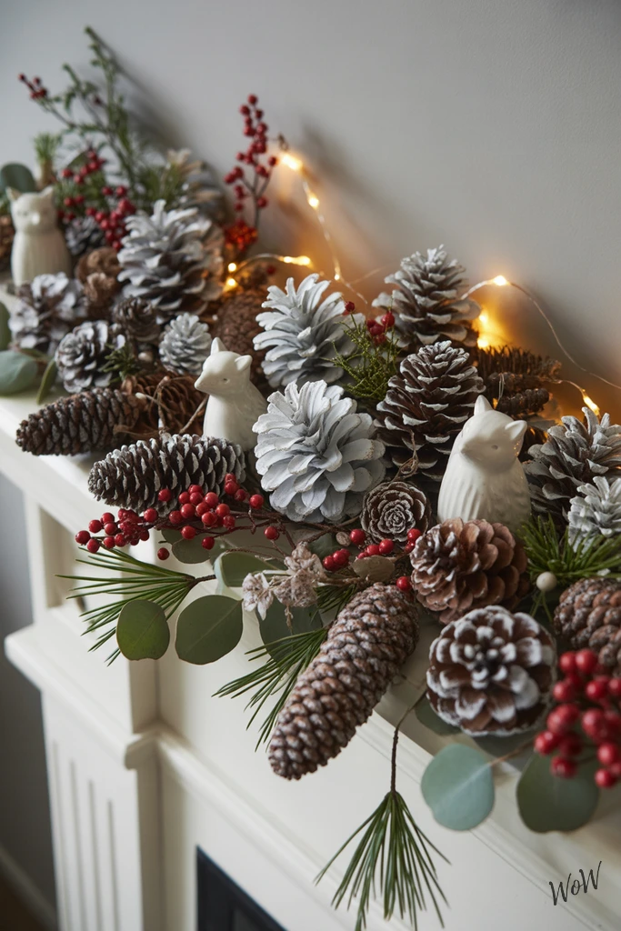 Start by grabbing a fresh pine garland (faux works too, but real smells amazing) and lay it right along your mantel’s edge, letting a few branches drape down for a relaxed, woodsy vibe. Tuck in some eucalyptus sprigs here and there to add a little contrast-those blue-green leaves really pop, you know?