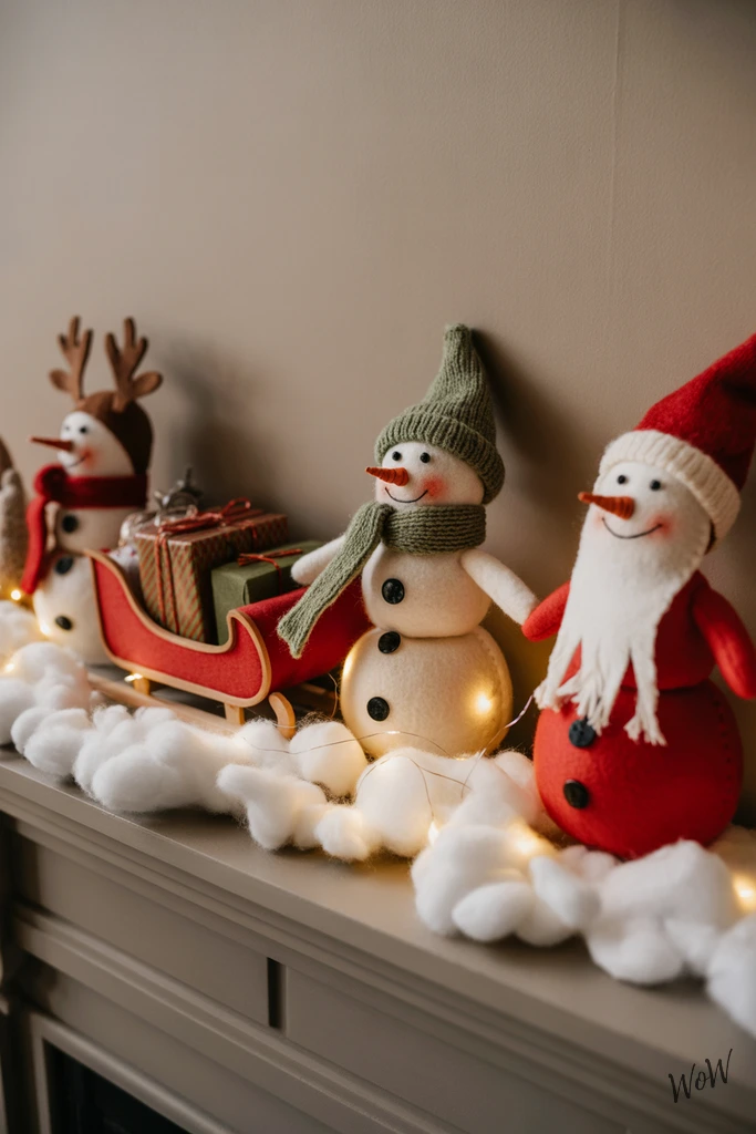 Arrange them in a playful group, nestling cotton batting “snow” around their feet to create a soft, wintry landscape. Don’t forget the details: tiny knitted scarves and hats really make each figure pop, and you can even add a miniature sleigh loaded with wrapped presents for extra charm.