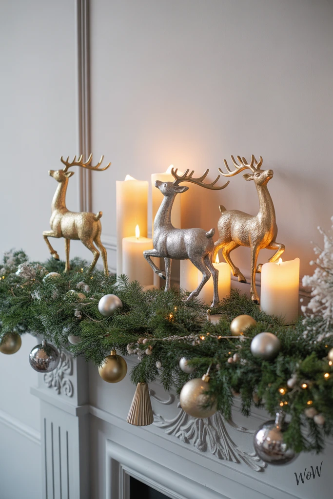 Add clusters of mercury glass ornaments and white pillar candles of different heights, but don’t go overboard; keep things balanced so the reindeer stay the stars. For a sophisticated, Scandinavian vibe, stick to metallic accents and clean lines-no need for extra color or fuss.