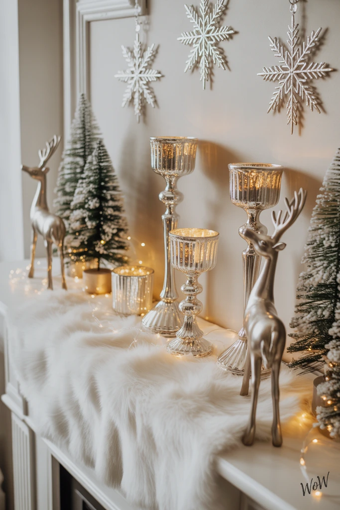 Stand a couple of mini white-flocked Christmas trees at each end, their snowy branches really pop against the fur. Scatter a few crystal snowflake ornaments to catch the light, and finish with shiny silver reindeer figurines standing tall at each side.