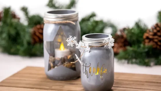 Candles in mason jars create a warm, rustic, and magical touch for your Christmas table decoration. These frosted jars, wrapped with twine and accented with delicate snowflakes, beautifully capture the cozy charm of the holiday season.