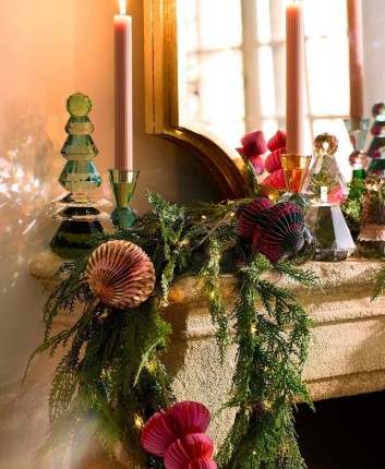 Weave in a strand of twinkling fairy lights for a cozy glow, then tuck in burgundy velvet ribbon and gold-painted eucalyptus sprigs for a luxe touch. Cluster in red berries and pinecones (give them a quick dusting with faux snow for extra wintry flair), and nestle white pillar candles among the greenery.