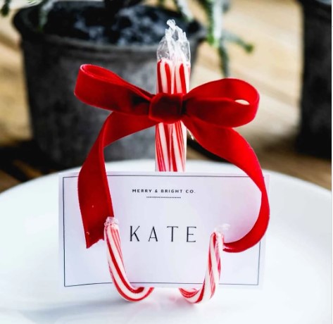 A bright red ribbon tied at the top completes the cheerful holiday look, blending whimsy with elegance. Simple to make yet eye-catching, these candy cane place cards double as décor and a treat, bringing a joyful, memorable touch to your holiday dinner table.