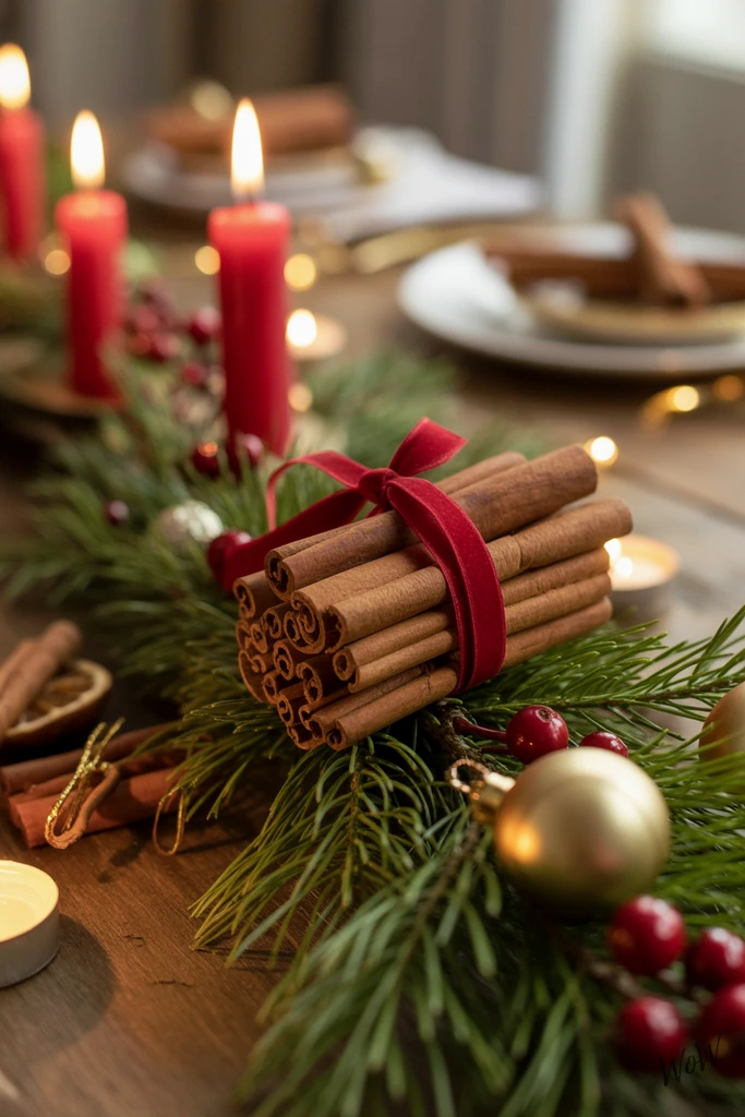 Gather a handful of cinnamon sticks-about five or six per bundle looks just right-and tie them together with a plush red velvet ribbon, letting long tails drape for a relaxed yet festive vibe. Nestle these bundles into a bed of fresh pine sprigs arranged along the center of your table, the greenery’s texture and scent instantly feels like Christmas.
