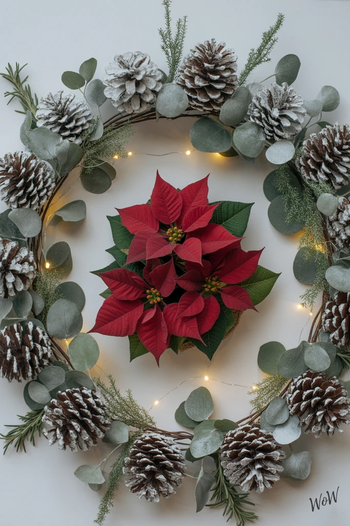 Let them dry completely, you don’t want sticky fingers later. Arrange the frosted pinecones in a loose wreath around the centerpiece, tucking burgundy poinsettias right into the circle for that dramatic pop of color.