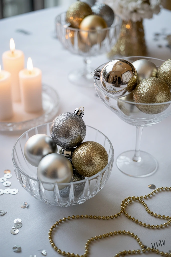 Picture crystal bowls lined up along your holiday table, each overflowing with a mix of silver and gold glittery ornaments. The trick is to use different sizes-some big and bold, some tiny and delicate-so the light dances across them in every direction.