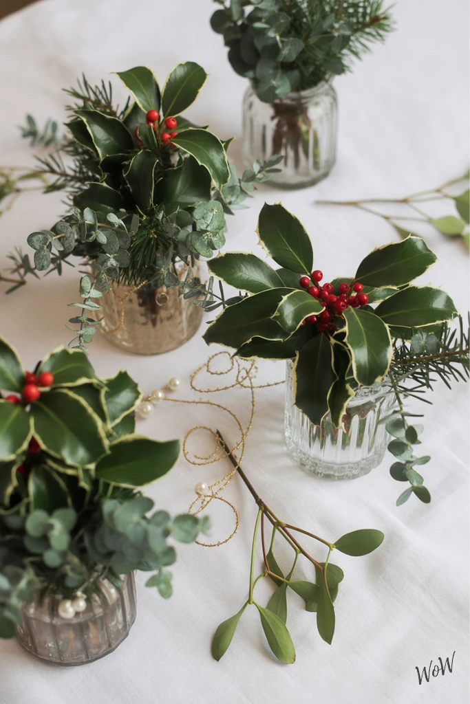 Clusters of shiny holly leaves and bold red berries, paired with fragrant eucalyptus, all nestled together in small mercury glass vases. These little vessels shimmer on a crisp white table runner, creating a festive, luxe vibe without feeling overdone.
