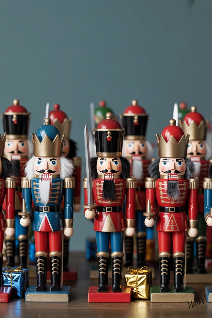 Mix up the heights and poses to keep each setting unique: maybe one nutcracker is brandishing a tiny sword, while another clutches a miniature metallic-wrapped present. To do this, pick up a set of varying nutcracker ornaments or figurines from a craft store or holiday shop, then arrange them so each guest gets their own “guardian.” You can even tie a name tag around a nutcracker’s arm for a personal touch, it’s a simple way to make everyone feel special.