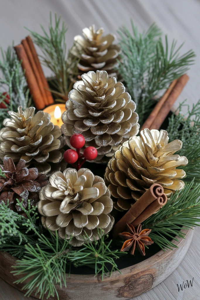 Dip just the tips in gold acrylic paint (use a small brush or even your finger), let them dry, then arrange the pinecones in a rustic wooden bowl. Tuck in fresh evergreen sprigs around and between the pinecones, add cinnamon sticks and whole star anise for a warm, festive scent that’ll linger.