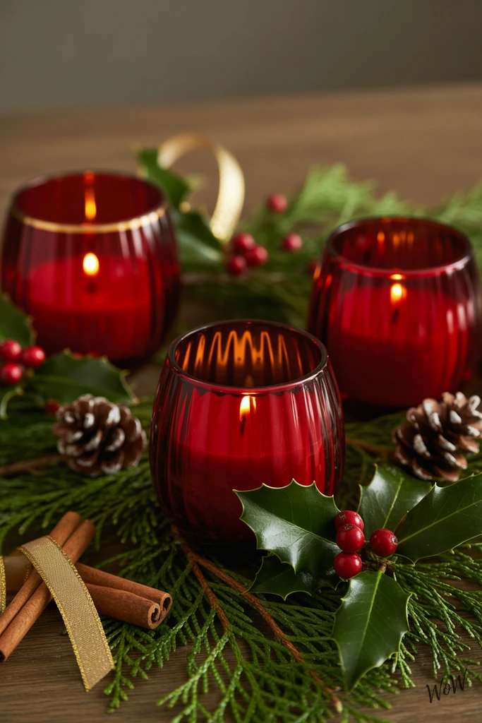 Next, nestle sprigs of holly and bright red berries between the candles, the contrast makes everything pop. Scatter a few small pinecones and cinnamon sticks at the base, they add texture and a cozy, Christmasy aroma.