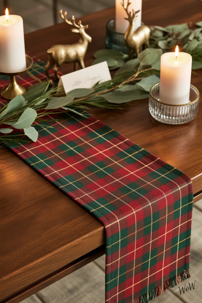 Scatter fresh eucalyptus leaves along the center; the soft green leaves contrast beautifully against the plaid and add a subtle, inviting scent. Pop a few white pillar candles in mercury glass holders for a warm, old-world glow, it’s both romantic and practical for evening gatherings.