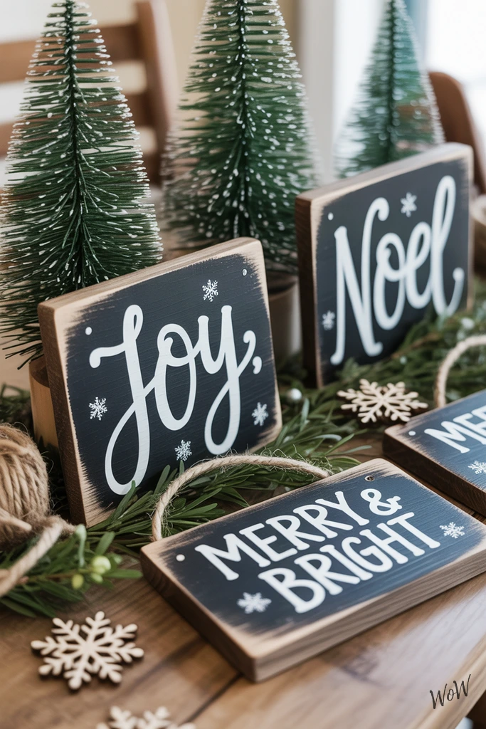Handcrafted wooden signs add that warm, rustic touch to your Christmas table, especially when you go for those with hand-lettered messages like “Joy,” “Noel,” or “Merry & Bright.” Grab some wooden planks-reclaimed wood looks especially charming-and sand the edges for a distressed, cozy vibe.