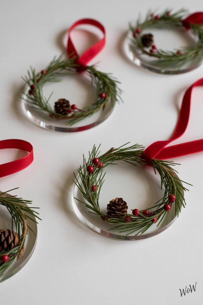 These handcrafted coasters are both functional and adorable. Each one starts with a ring base (wood or sturdy cardboard works), which you’ll cover by gluing preserved evergreen sprigs, baby pinecones, and little faux berries, arranging them so the textures pop.
