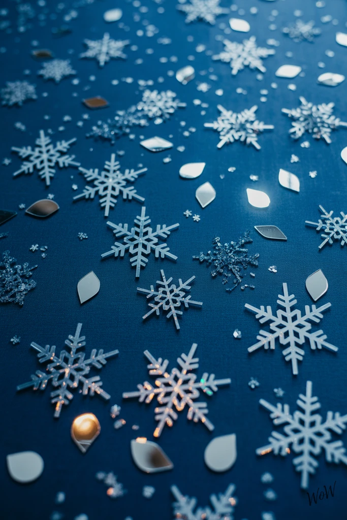 Scatter a mix of laser-cut crystalline snowflake confetti over a midnight blue tablecloth for instant winter magic. Go for iridescent white and silver pieces in sizes from dime to quarter-this creates a layered, dimensional effect that feels luxe and playful.
