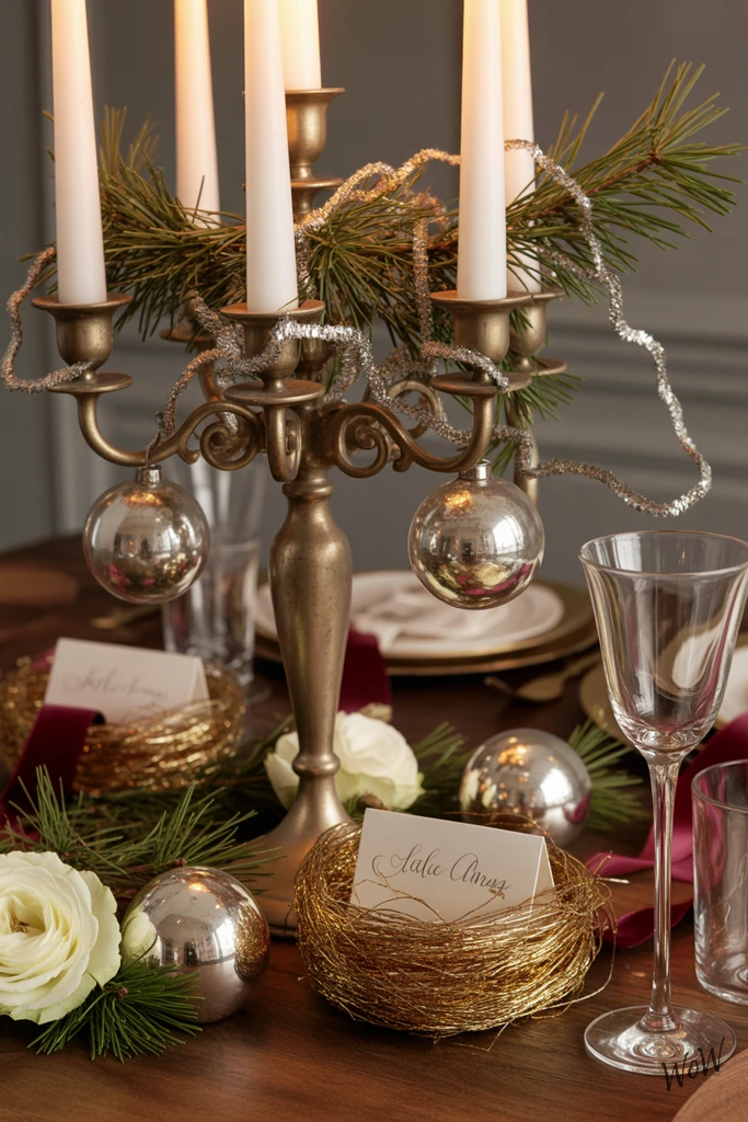 Tinsel accents bring instant vintage charm to your holiday table, and they’re surprisingly easy to work with. Drape sparkling gold tinsel loosely around candlesticks, letting a few strands fall naturally for that effortless, old-Hollywood look.