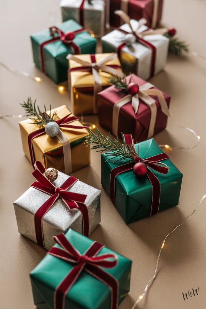 A line of tiny gift boxes, each wrapped in rich metallic paper-think silver, gold, and lush emerald-running straight down the center of your table. You’ll want to pick boxes of varying sizes for that playful, layered effect, then wrap them snugly with high-quality paper (the shinier, the better).