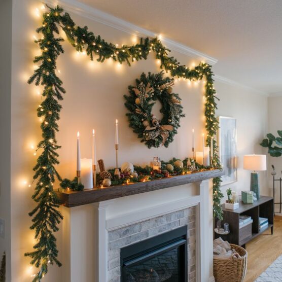 Thick pine garland draped across a living room wall sets a cozy, festive mood, especially when you weave in warm white fairy lights. The trick is to let the garland hang in a gentle swag or zigzag shape, secure it with clear hooks or festive ribbon so it looks intentional but not rigid.