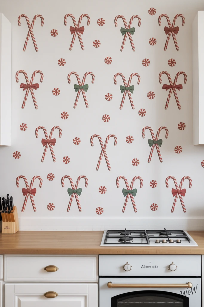 Candy cane wall stickers can introduce a festive, playful vibe in your kitchen. Go for a mix of sizes-stickers ranging from 4 to 12 inches look best scattered in clusters for that fun, “designed but not too perfect” look.