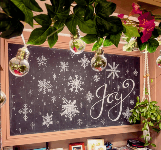To pull this off, grab a chalkboard (or make one with chalkboard paint on wood), then use a chalk marker for crisp lettering-don’t stress about perfection, hand-drawn holly, snowflakes, and swirls actually boost the charm.