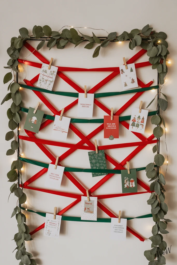 For even more cheer, frame the card grid with a fresh eucalyptus garland and wind some fairy lights through it; the subtle greenery and twinkle instantly pull the whole look together. The cards become part of your decor, not just a pile on a table, and you’ll love seeing everyone’s well-wishes displayed.
