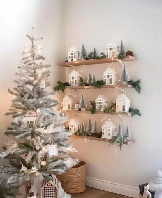 Tiny Christmas trees lined up on floating shelves bring a playful, festive vibe to any wall, especially when you mix and match styles. Go for bottlebrush trees in mint green and cherry red next to flocked pines covered with teeny ornaments, add a couple of hand-painted ceramic trees with those classic rainbow light holes.