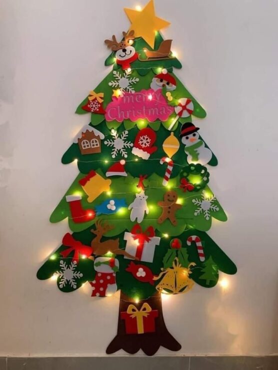 A felt Christmas tree wall decal makes the holidays more playful. The big, emerald-green felt tree sticks right onto your living room wall, it’s soft and safe for little hands.