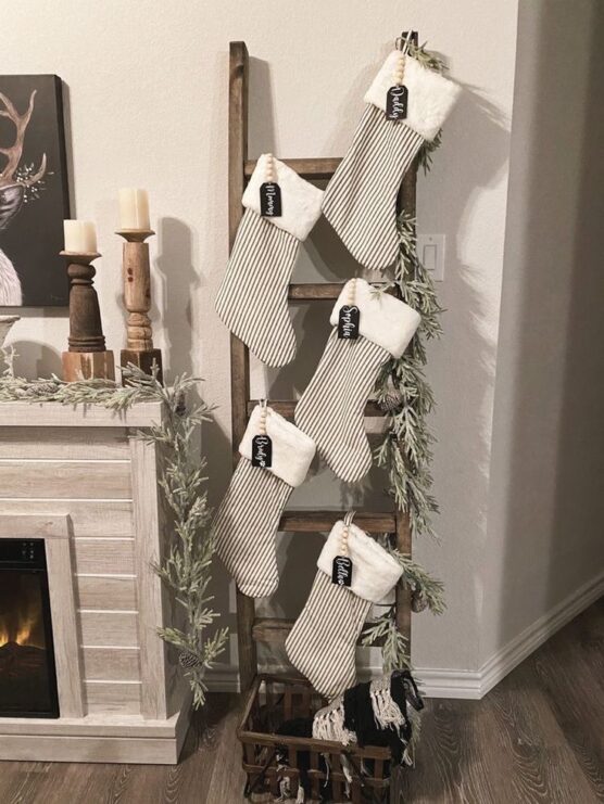 Instead of the usual mantel, hang the stockings from an old wooden ladder leaned casually against the wall; it’s unexpected and charming, plus it saves mantel space. Personalize each stocking with a wooden name tag tied on with twine, then tuck in a sprig of holly for a pop of color and a little greenery.