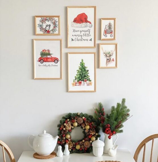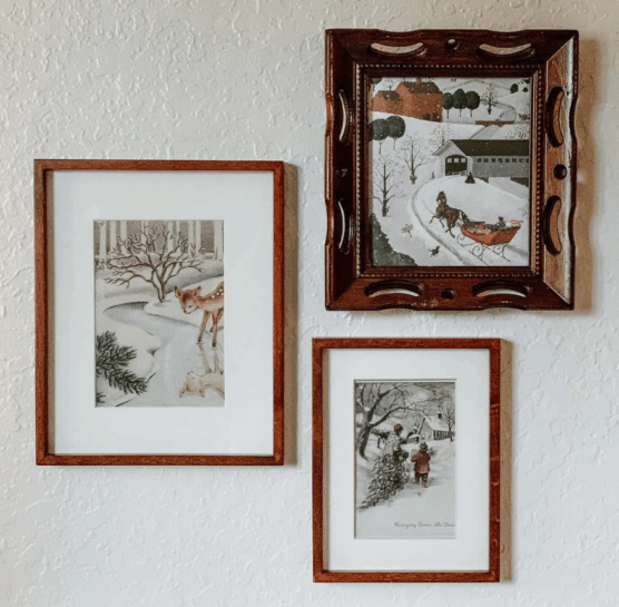 Framed vintage Christmas prints bring old-school holiday charm to your space, they’re a treat for anyone who loves nostalgia. Get a mix of Santa illustrations, Victorian holiday scenes, and retro ads from thrift stores, Etsy, or printable archives online.
