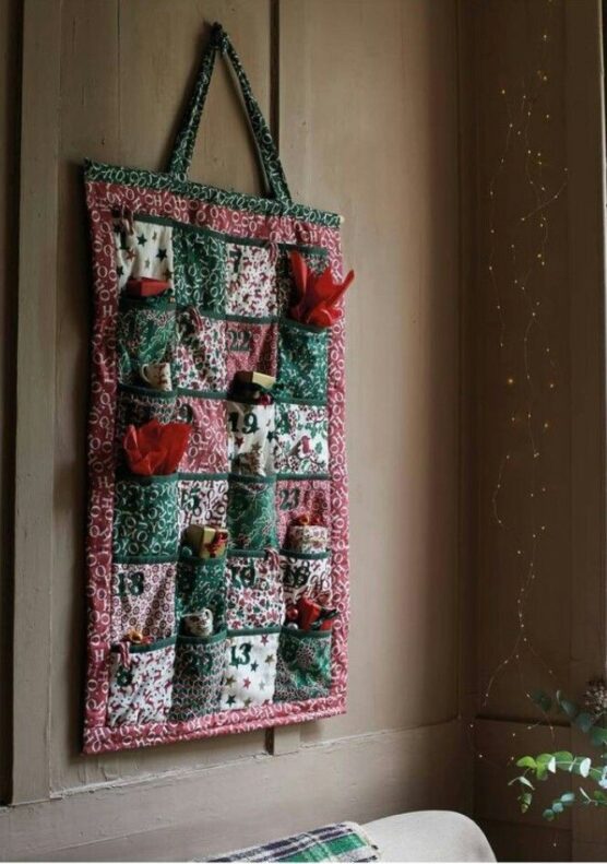 A fabric wall-hanging advent calendar brings warmth and anticipation to your holiday space, especially when the 24 numbered burlap pockets are dressed in classic red and green patterns. Hang it on a prominent wall so the cheerful colors and cozy textures can pop; the embroidered snowflakes and pine cone accents add that perfect handcrafted touch, it’s festive without being over-the-top.