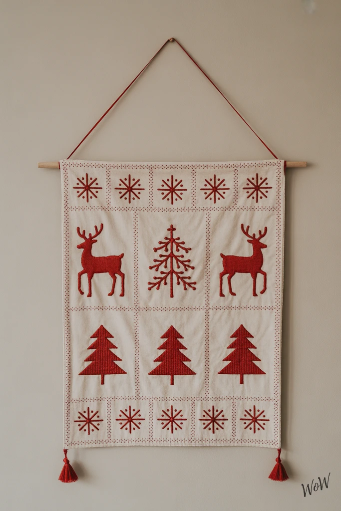 Hand-stitched Nordic wall hangings bring a cozy holiday vibe that’s hard to beat, the red and white palette feels crisp and festive against a neutral background. Hang one featuring reindeer, snowflakes, and pine trees-these classic motifs instantly signal Christmas without feeling over-the-top.