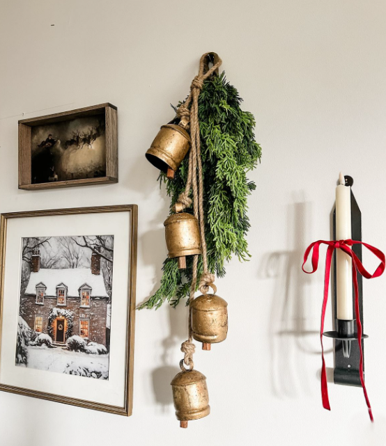 A cascading wall hanging of vintage-style silver and gold bells amps up the festive vibes-especially when you use lush red velvet ribbons in different lengths. Start by tying clusters of bells onto ribbons, letting them hang at staggered spots for that casual, artful look; you want the arrangement to feel a little unbalanced, not perfectly symmetrical.