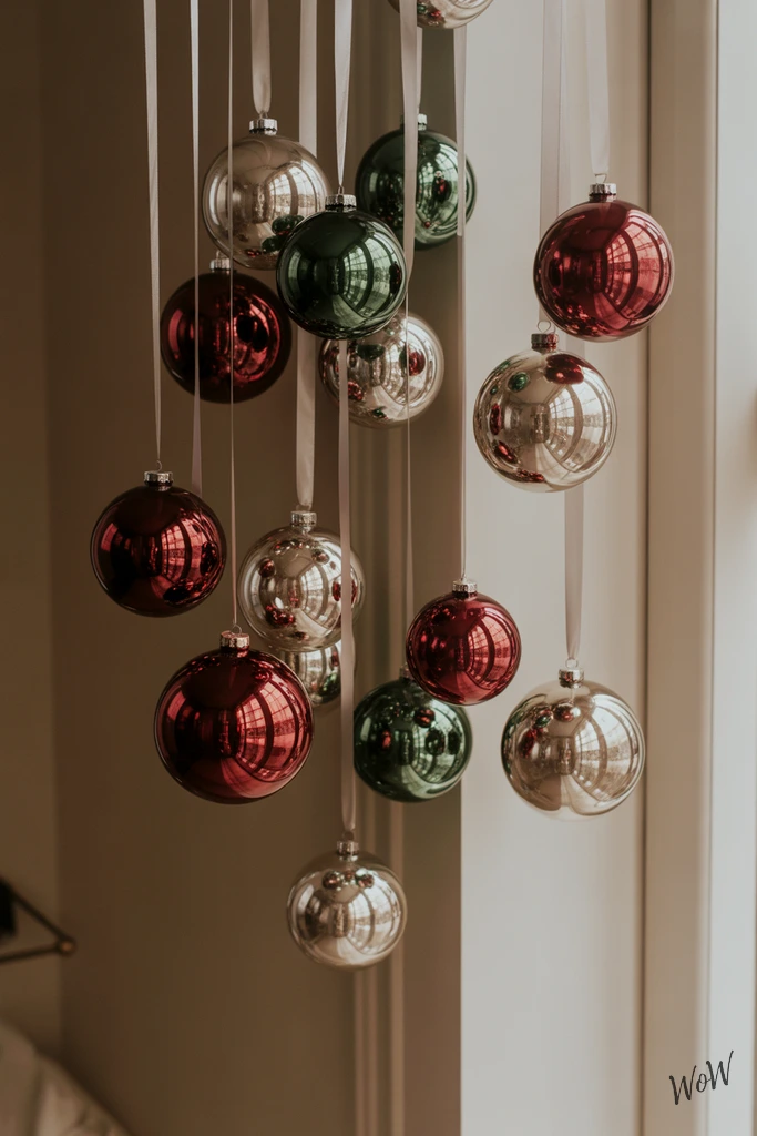 Stick to a rich palette: burgundy, emerald green, and champagne gold work beautifully together, each sphere catching and bouncing the light around the room. Anchor the ribbons to the ceiling with clear hooks or pushpins right near a wall, so the ornaments look like a deconstructed Christmas tree (but way more artsy).