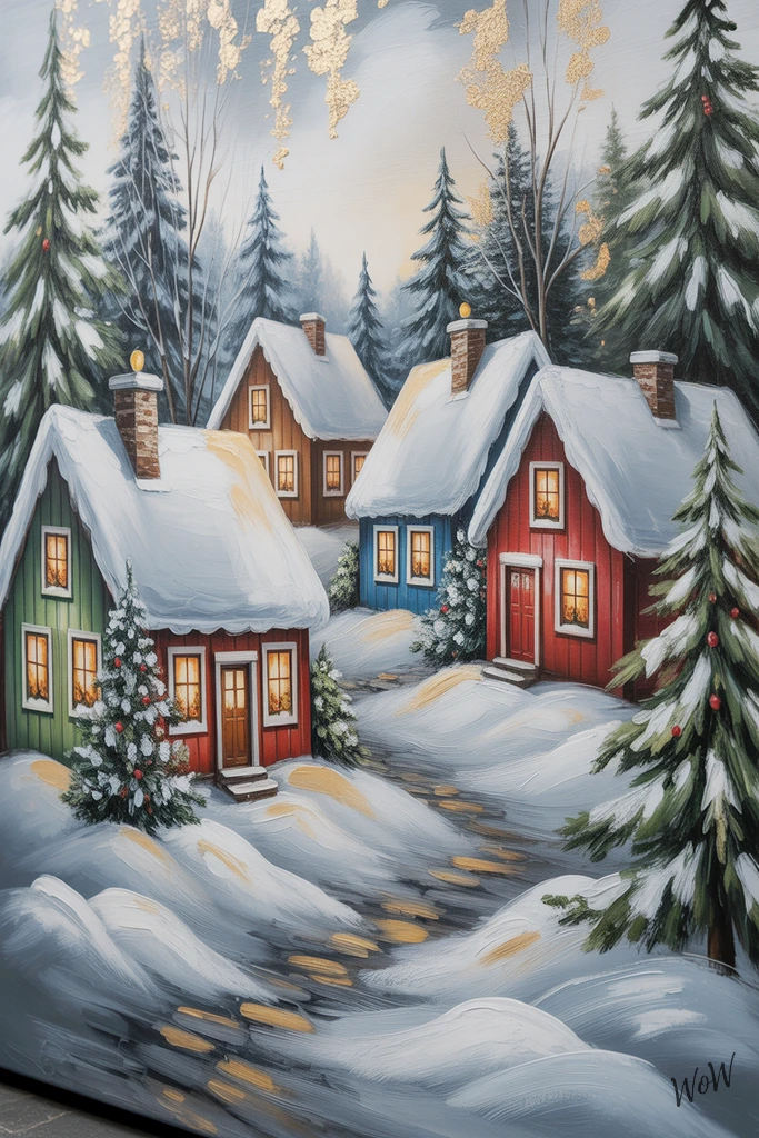 The illuminated cottage windows give off a cozy glow, while towering evergreens add that classic Christmas feel. Choose pieces that blend traditional reds, greens, and whites with a modern twist, maybe some bold outlines or abstract touches.