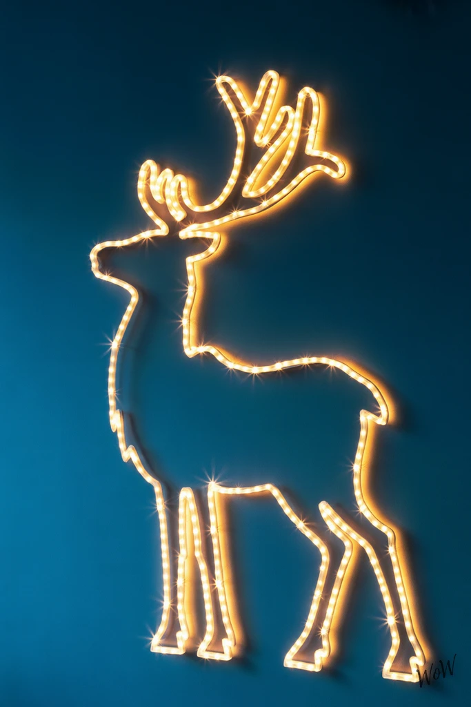 A reindeer silhouette outlined with warm white LED lights bring cozy, Nordic vibes to your wall, the halo of gentle light makes the reindeer’s shape pop against a deep blue background. You just hang a flat, cut-out reindeer shape-wood, metal, or even sturdy cardboard works-then wrap or glue a flexible LED strip around its outline.