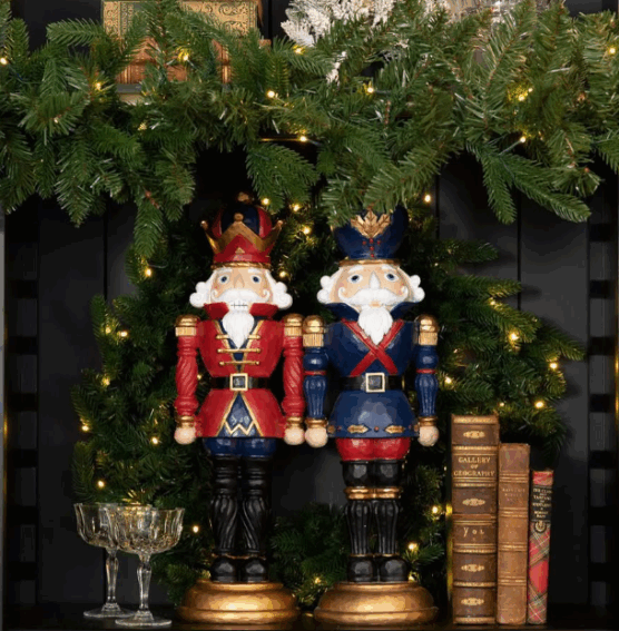 Fairy lights tucked into the greenery add a soft twinkle, the kind of glow that makes everything feel just a bit more magical. For a pop of color, scatter small red ornaments among the garland; gold accents on the nutcracker or shelf can catch the light, drawing the eye.