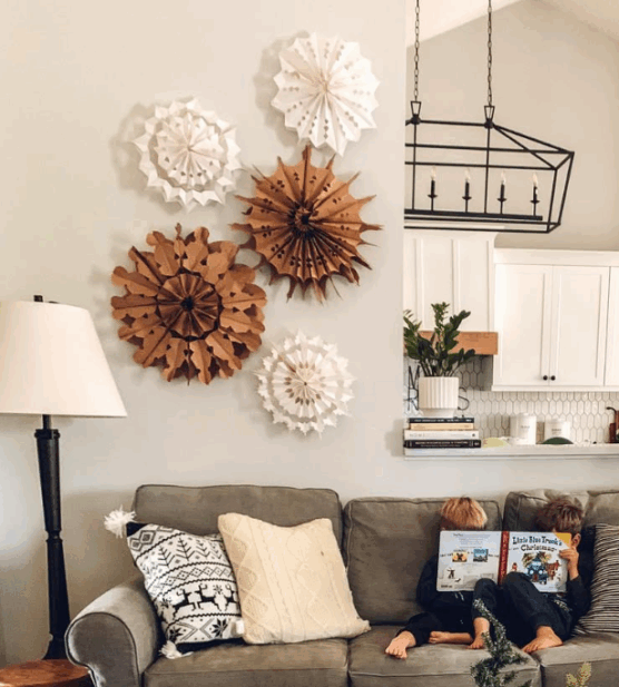 A stunning, glowing centerpiece that throws soft, playful shadows and feels both wintry and whimsical. Hang it above a mantle or sofa for maximum impact; plug it in at dusk, and your whole room feels instantly enchanted, it’s low-fuss, reusable each year, and way more memorable than a plain wreath.