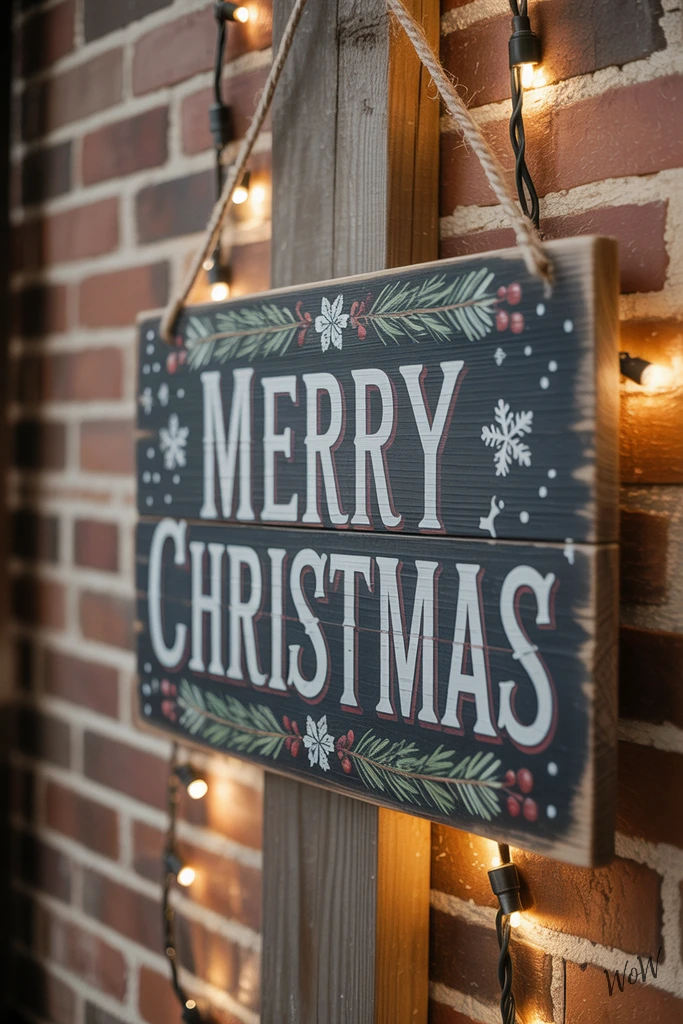 A weathered wooden sign with hand-painted “Merry Christmas” nails that cozy, rustic vibe. The vintage-style lettering pops against the aged wood, and it feels like something you’d see in a classic holiday movie.