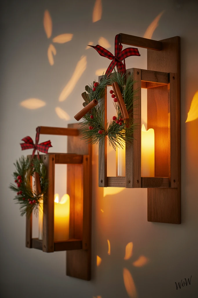 Rustic wooden wall-mounted lanterns give your space a cozy, old-fashioned vibe that’s perfect for Christmas. Hang them on a white wall for maximum contrast, letting the golden glow from flickering LED candles spill out and create lively holiday shadows-reindeer, sleighs, or whatever shapes you like.