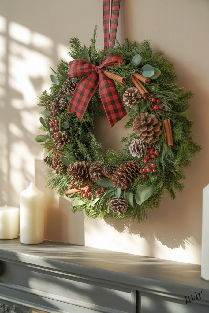 A lush evergreen wreath bursting with texture-pinecones, red berries, and cinnamon sticks-brings quick holiday cheer to any wall. The look is rich and rustic, especially with a bold buffalo plaid bow finishing it off.