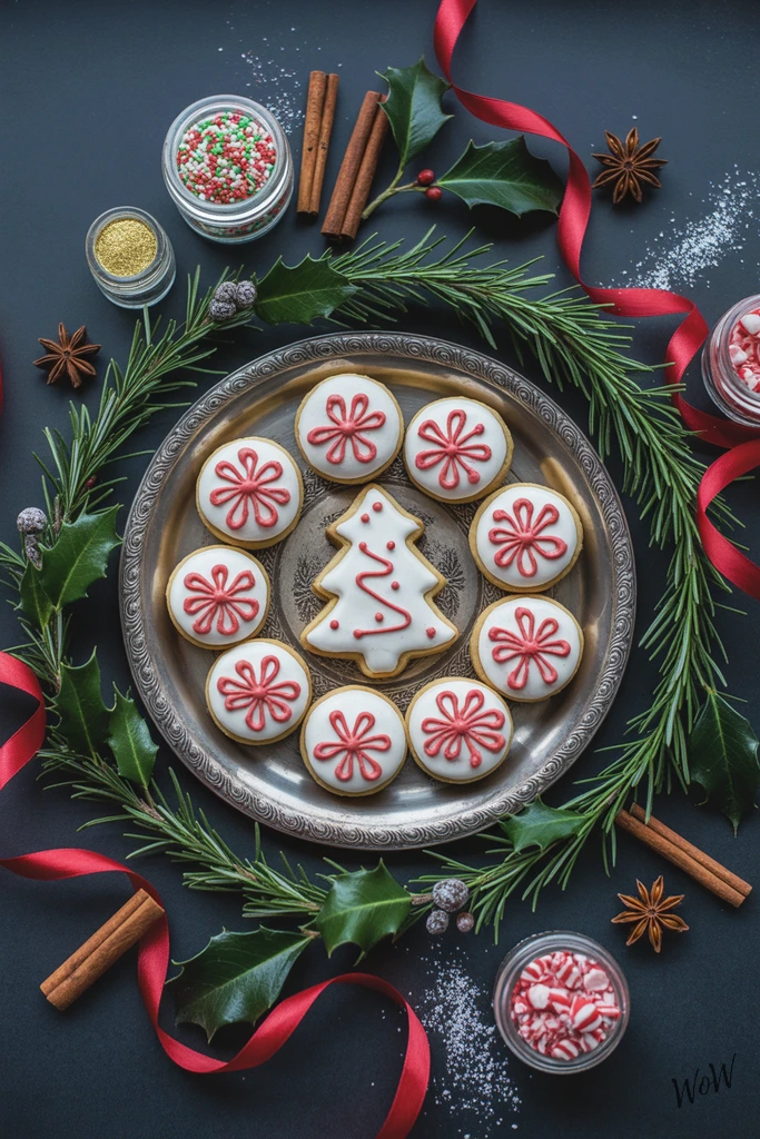 Scatter whole star anise for a touch of rustic charm, while small glass jars filled with colorful sprinkles, edible gold dust, and crushed peppermint invite guests to DIY their cookies right at the table. Frame the platter with holly leaves and tiny pine cones, creating a natural border that feels straight out of a storybook.