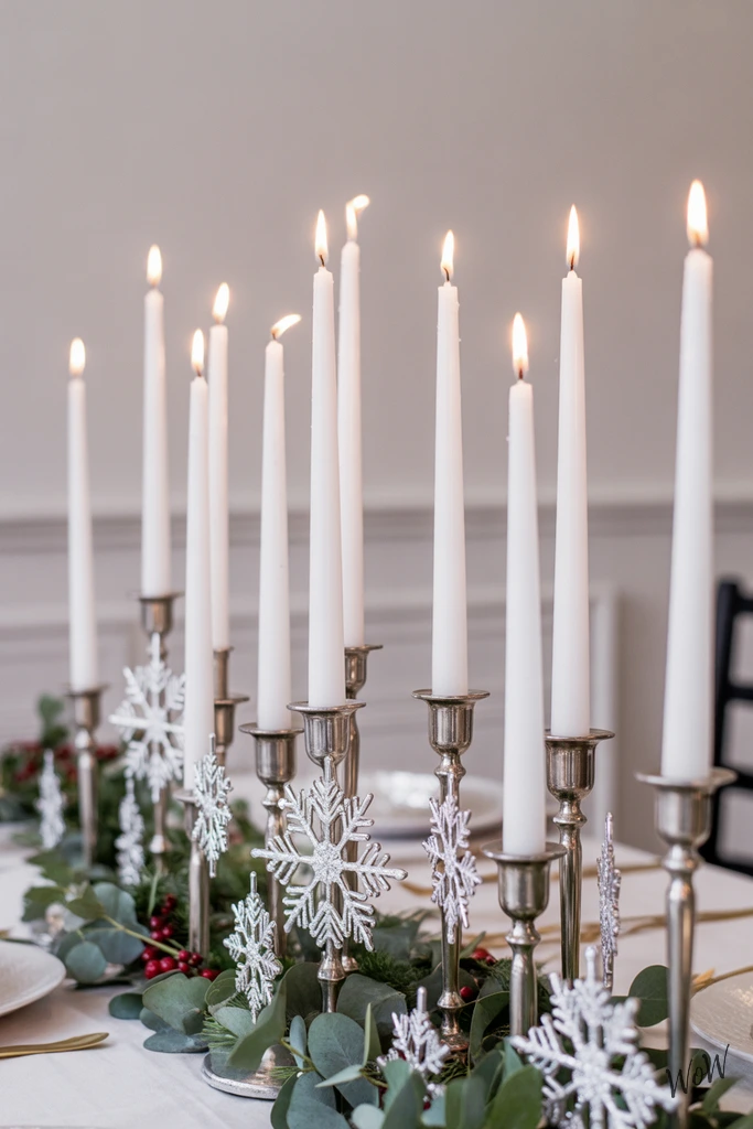 Place them in a neat row or cluster them for a more relaxed look, either way, the flickering candlelight will bounce off the silver, making the whole setup glow. Scatter crystal and silver snowflakes in between, they’ll catch the light and add a festive sparkle.