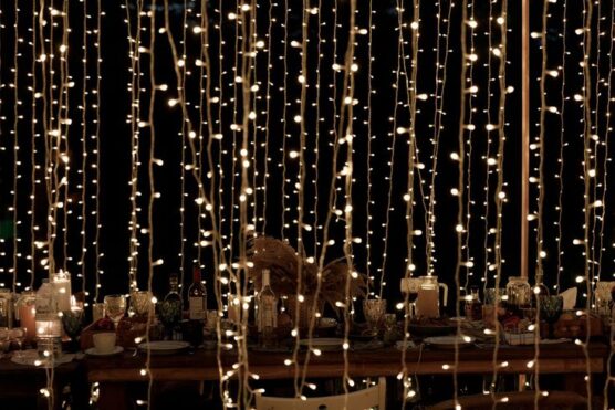 Place your table near fairy lights or string them along the backdrop, so the whole scene glows with a cozy, inviting ambiance. This setup works for intimate dinners or bigger gatherings, your guests will love the festive touch!