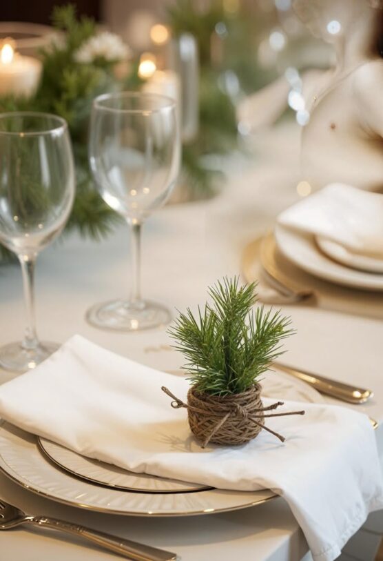 Just slip them onto crisp linen napkins before placing each setting, letting the greenery pop against the fabric. For an extra special look, scatter pine needles, cinnamon sticks, or little silver bells around each plate, the napkin rings tie everything together without much effort.