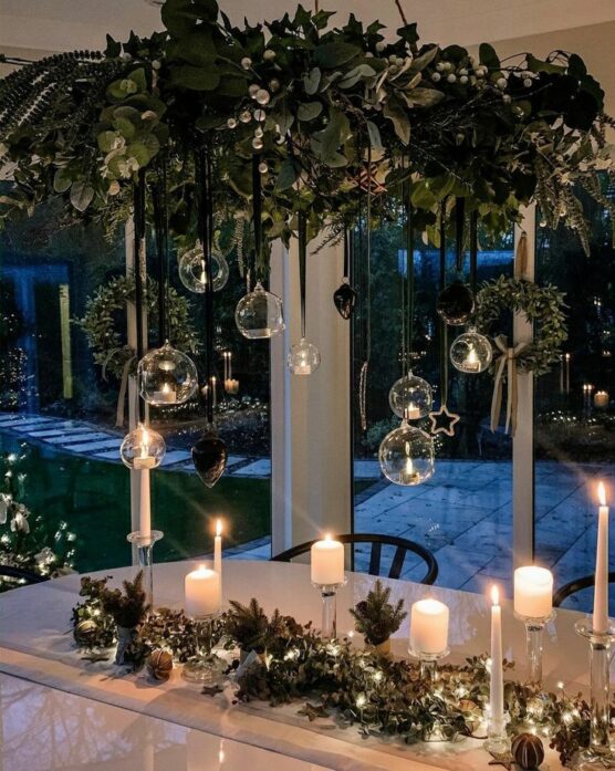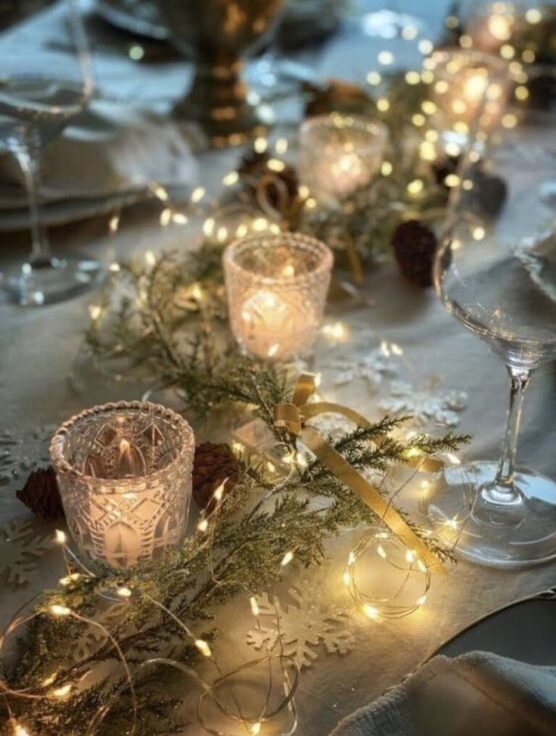 Gold and white twinkle lights can turn a simple table into a glowing focal point. Instead of hanging them overhead, wind the lights through a low arrangement of greenery, candles, or garlands running along the center of your dining table. Faux eucalyptus, pine branches, or fresh winter greens make the perfect base, with the lights peeking softly through the leaves.