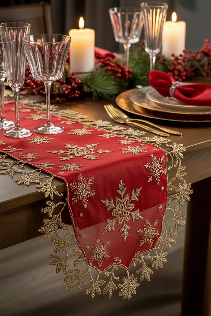 A red and gold table runner sets a regal vibe for your Christmas dinner, it’s all about those lush colors and fine details. Go for a runner with embroidered snowflakes or subtle gold thread-this adds texture and catches the candlelight beautifully.