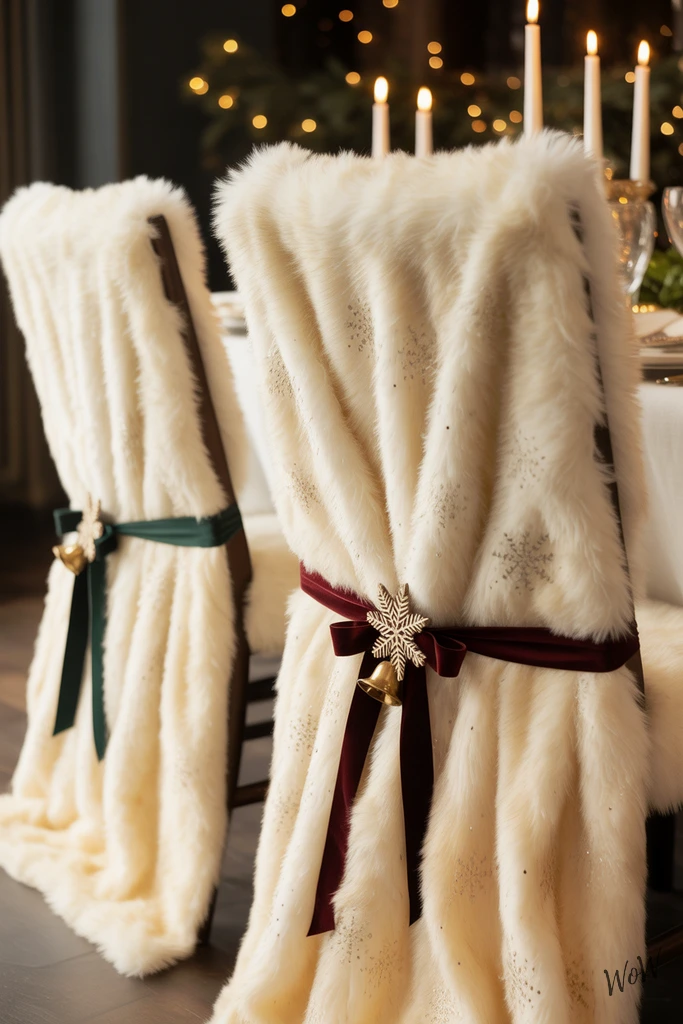 Look for faux fur with a hint of sparkle-tiny metallic threads woven in will catch candlelight and add a subtle wintery shimmer. Secure each cover with a deep green or burgundy velvet ribbon tied in a bow, then add a finishing touch-tiny gold bells or wooden snowflakes for a festive jingle.