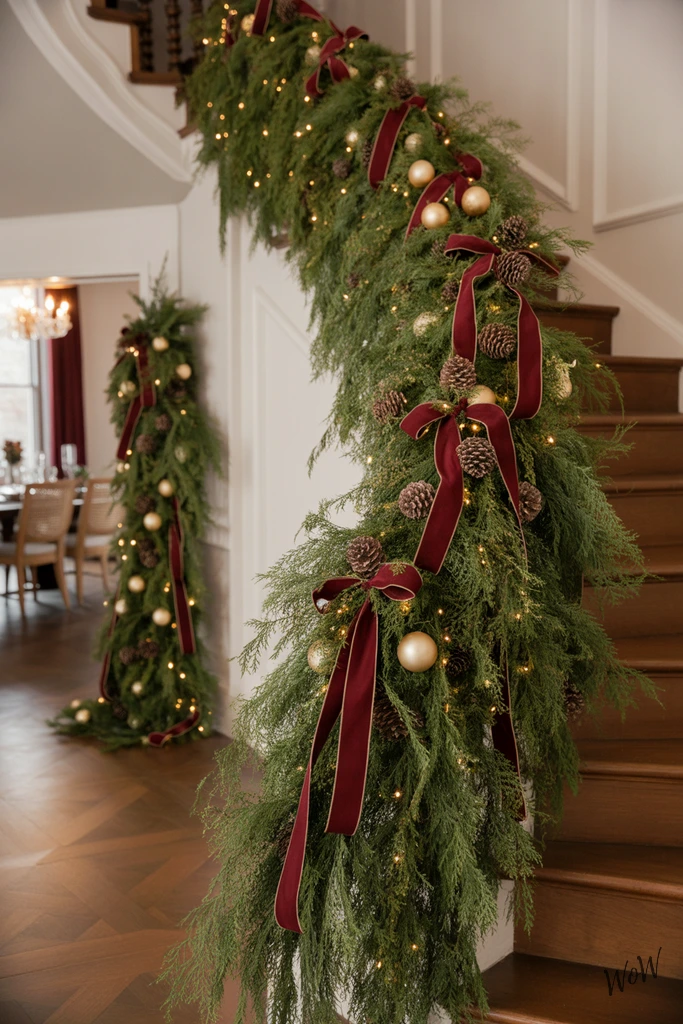 Drape your staircase with thick evergreen garland, tucking in loops of deep burgundy ribbon for a dramatic, upscale vibe. Wind strands of warm fairy lights through the greenery, letting them peek out for a gentle glow at night.